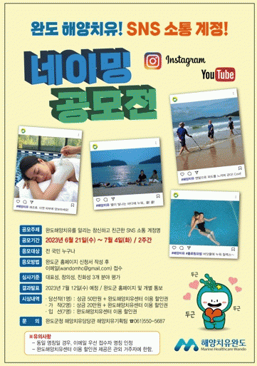 공모 주제는 ‘완도 해양치유’에 대해 참신하고 친근하게 알릴 수 있는 SNS 소통 계정명이며, 전 국민 누구나 참여 가능하다.