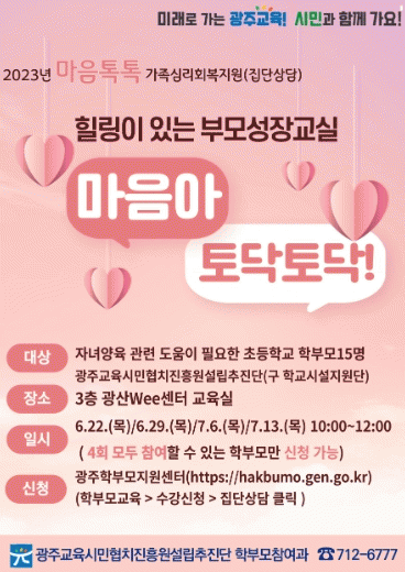 광주교육시민협치진흥원설립추진단 김진구 단장은 “‘마음 톡톡’ 가족심리회복지원으로 학부모의 자녀양육 과정 중 발생하는 문제에 대한 해결 방안 제시와 예방 효과를 기대한다”며 “가정 내 갈등이 있는 학부모들이 이번 가족심리회복지원 프로그램에 적극 참여해 행복한 가족관계가 형성됐으면 좋겠다"고 밝혔다.