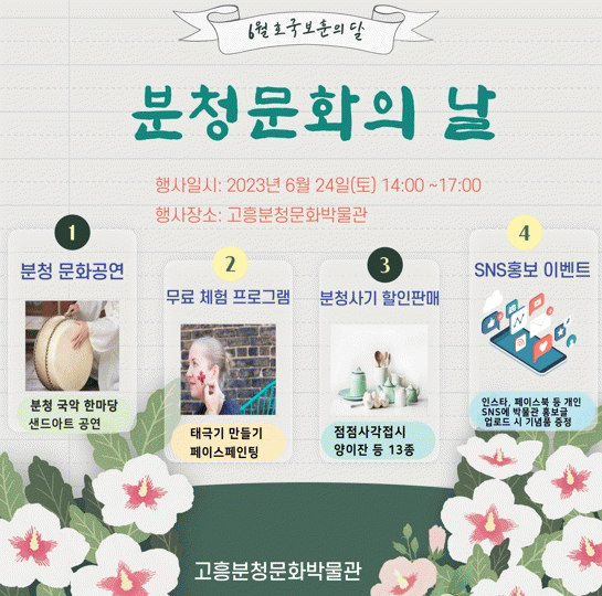 한편, ‘분청 문화의 날’행사는 7월, 9월, 10월, 11월 마지막 주 토요일 오후 2시에 분청문화박물관 일원에서 박물관 무료관람, 정기 문화공연, 홍보 이벤트, 특별 무료체험 등 다양한 프로그램으로 운영된다.