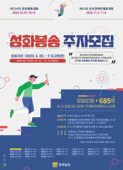 신청자격은 성화봉송에 건강상 문제가 없는 목포시 거주 만 15세 이상인 자로 누구나 지원할 수 있다. 참여를 희망하는 경우 목포시 전국체전추진단(목포국제축구센터 2층) 및 주소지 동 행정복지센터 방문하거나 이메일로 접수가 가능하다.