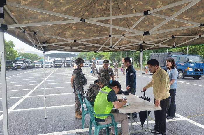 이날 응소 차량은 지난 13일 훈련통지서를 교부한 화물카고(2.5~4.5톤) 45대, 승용 1대, 승합 1대, 소형화물 1대 등 총 48대다.