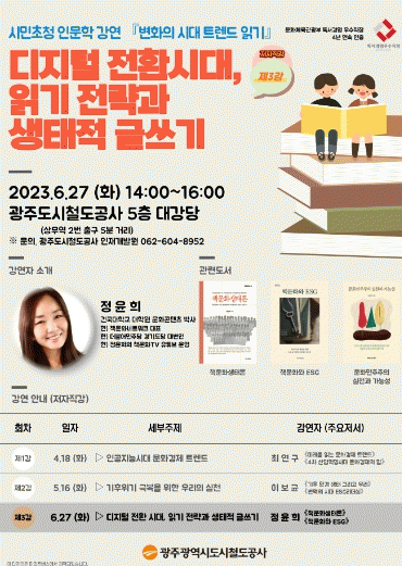 이번 독서아카데미는 시민 누구나 참여 가능하며, 자세한 사항은 광주도시철도공사 인재개발원으로 문의하면 안내받을 수 있다.