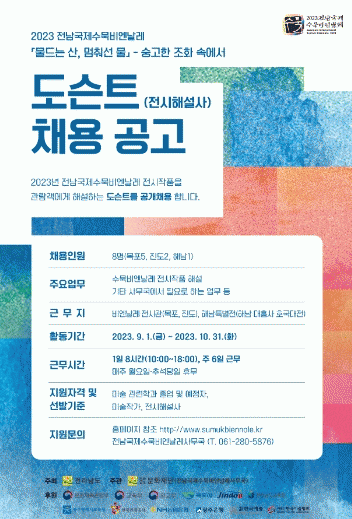 박근식 전남국제수묵비엔날레 사무국장은 “2023 전남국제수묵비엔날레의 위상을 높이고 한국 수묵의 가치를 세계에 알릴 전문성 있는 전시해설사를 모집하니 많은 관심과 참여 바란다”고 말했다.