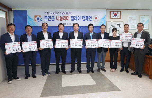 ‘220인의 나눔리더 릴레이 캠페인’은 나눔을 선도하는 리더가 나눔 문화 확산의 물꼬를 트는 운동으로 전남 사랑의 열매에 연 100만 원 이상을 일시 기부하거나 약정하면 나눔리더 회원이 된다. 전남 22개 시군이 참여하는 이번 모금에서 기관·사회단체장으로 1호에서 10호까지 가입한 시군은 무안군이 처음이며, 다음 달에는 개인사업자로 11호에서 13호까지 가입이 예정돼 있다.