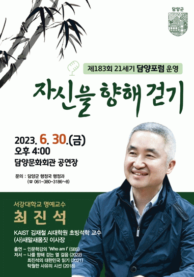 이번 강좌는 인문학의 대가로 불리는 최진석 교수를 특별초청해 ‘자신을 향해 걷기’라는 주제로 자기가 원하는 것을 스스로 수행하는 삶에 관한 강연을 통해 인문학적 시각에서 삶의 의미와 가치를 되새겨 볼 예정이다.