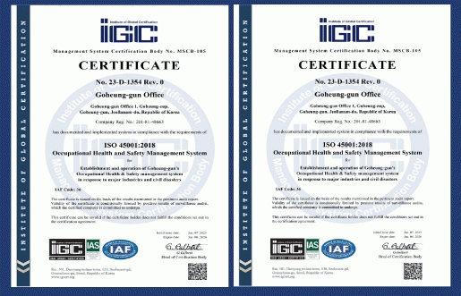 ‘ISO 45001’은 국제표준화기구(ISO)와 국제노동기구(ILO)가 2018년에 제정한 안전·보건 분야 최고 수준의 국제 인증으로서 다양한 유해·위험으로부터 산업재해를 예방하고 쾌적한 근무환경을 조성하기 위한 체계적인 시스템을 갖춘 사업장에만 부여되는데, 이번 인증 획득은 고흥군의 안전·보건 경영시스템이 국제적인 기준에 적합하다는 것을 의미한다.