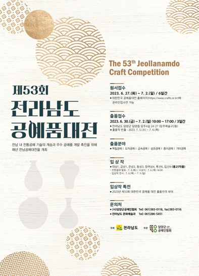 제53회 전남도 공예품 대전에 대한 자세한 사항은 전남도 누리집 ‘고시·공고’를 참고하거나 전남도 문화예술과, (사)담양군공예인협회로 문의하면 된다.