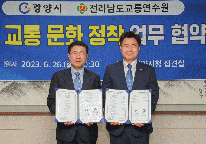 이날 협약식에서 정인화 광양시장과 이병희 전라남도교통연수원장은 사람 중심의 교통문화 확립을 위한 안전교육과 사고 예방 홍보 활동 등에 관한 내용의 협약에 서명했다.