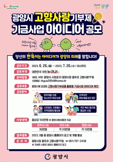 제출된 아이디어는 광양시 고향사랑기금운용심의위원회 심사를 거쳐 최종 선정되며, 심사 결과는 9월 중 광양시 홈페이지 고시공고란에 게시하고 개별적으로 안내할 예정이다.