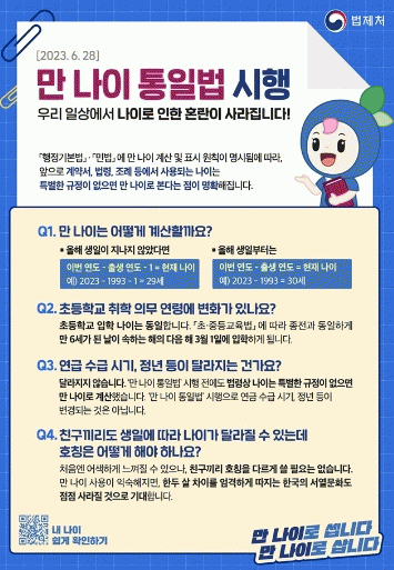 해당 법률과 자치법규 개정 및 시행으로 오는 28일부터는 특별한 규정이 없는 한 법령이나 공문서 등에 표시된 나이는 모두 ‘만 나이’로 해석하게 된다. 이에 따라 한국식 나이, 만 나이, 연 나이 등 다양한 나이 사용으로 인한 법적 혼란이나 민원이 해소될 것으로 기대한다.