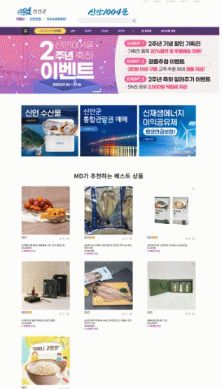 ‘신안1004몰’ 2주년 맞이 축하이벤트는 20% 할인 기획전, 3만 원 이상 구매고객 경품(모바일 커피쿠폰) 증정, 이벤트 내용 SNS 공유시 적립금(2,000원) 증정 등 다양한 혜택이 주어진다.