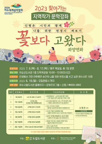 참여를 원하는 여수시민은 누구나, 오는 7월 4일까지 여수시립도서관 홈페이지 내 문화프로그램 또는 이순신 도서관 전화로 신청할 수 있다.