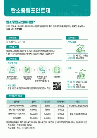 매년 상·하반기 2회에 걸쳐 탄소중립포인트를 부여하며, 인센티브는 절감 비율에 따라 연간 최대 10만 원까지 받을 수 있다.