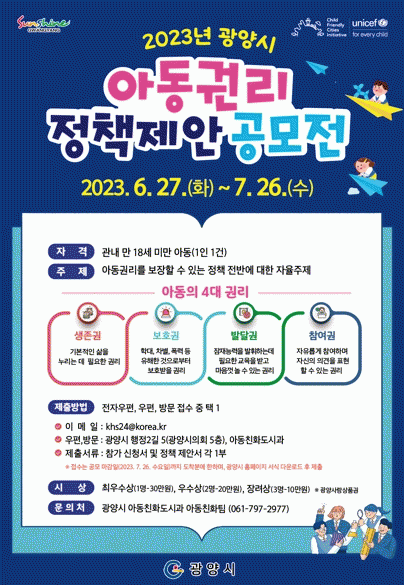 이번 공모 주제는 아동권리(△생존권 △보호권 △발달권 △참여권)를 보장할 수 있는 광양시 정책 전반에 대한 자율주제이며, 광양시 거주 18세 미만인 아동이면 누구나 참여 가능하다.