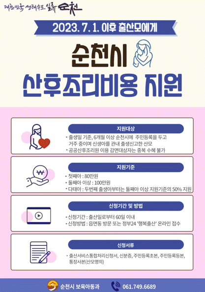 노관규 순천시장은 “이번 산후조리비용 지원을 통해 산모의 산후 건강 회복의 기회를 마련하고 출산가정의 경제적 부담을 경감하는 계기가 됐으면 좋겠다”라고 말했다.