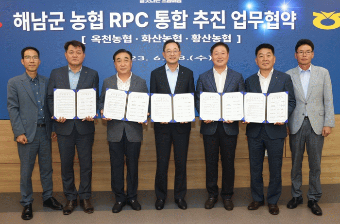 해남군은 지난 28일 군청 상황실에서 농협중앙회 해남군지부, 옥천·화산·황산농협 RPC 조합과‘농협 RPC 통합 추진을 위한 업무협약’을 체결했다.