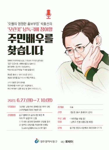 임택 동구청장은 “동구는 기록화사업을 통해 발굴·수집된 인문자원을 단순한 기록에 그치지 않고 현재로 불러내어 주민과 공유하고자 노력하고 있으며 이번 행사도 그 연장선”이라면서 “‘오월의 영원한 홍보부장’ 박효선의 작품세계를 함께 펼쳐나갈 주민 배우 모집에 많은 관심과 참여를 바란다”고 말했다.