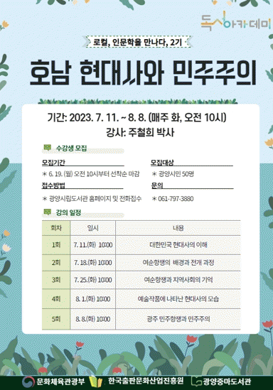 광양중마도서관은 '로컬, 인문학을 만나다'라는 주제로 독서아카데미를 오는 9월까지 운영할 예정이다. 주철희 박사가 진행하는 2기 ‘호남 현대사와 민주주의’ 강연은 7월 11일(화)부터 진행될 계획이다.