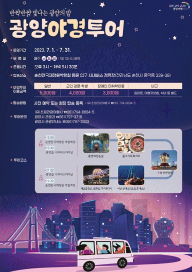 광양시가 7월 1일부터 31일까지 주말(금~일요일) 오후 3시, 순천만국가정원 동문 버스정류장에서 예약 없이 탑승할 수 있는 광양야경시티투어를 운영한다고 밝혔다.