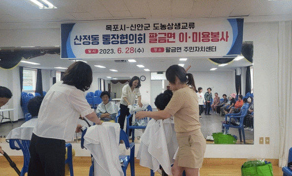 지난 29일 미용실이 없는 팔금면 어르신 30여명을 대상으로 이미용봉사를 하며 마을 어르신들의 안부를 묻는 등 훈훈한 시간을 가졌다.