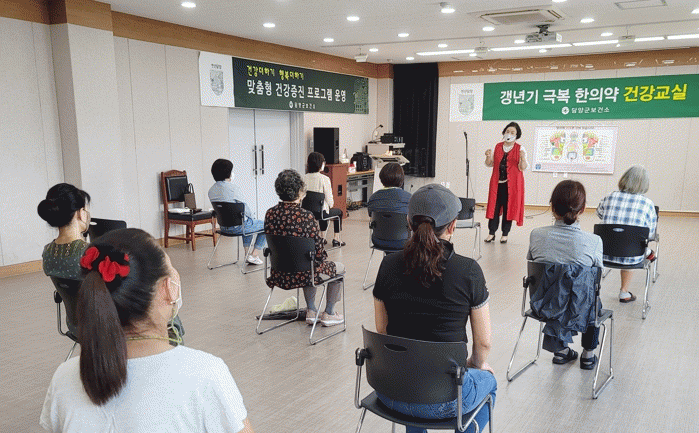 갱년기 극복 한의약 건강교실은 정신과 전문의의 우울증 예방 교육 및 상담, 한방 건강강좌, 음악치료, 공예 체험 등 다양한 프로그램으로 중.장년의 삶을 건강하게 보낼 수 있도록 돕는 프로그램이다.