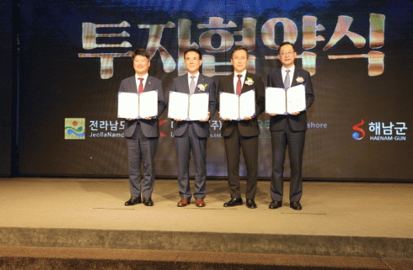 한편 이날 설명회에서는 전라남도와 해남군, 대한조선(주), 크레도오프쇼어(주)의 해상풍력 배후단지 조성을 위한 투자협약도 이뤄졌다. 크레도오프쇼어(주)는 신안 해상풍력발전협의체 회장사로 신안지역에 7개사업 2.4GW를 포함해 전남지역에서 4.5GW의 해상풍력사업을 추진하고 있다. 이번 협약을 통해 2028년까지 화원산단에 400억원을 투자하여 해상풍력 기자재 관련 생산과 관련된 전초기지로 세울 계획이다.
