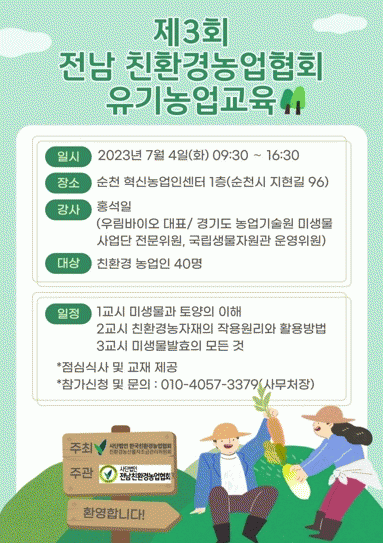 유덕규 전남도 친환경농업과장은 “저비용·고효율 농법 실천으로 유기농업 중심 지속가능 친환경농업을 확산하고 농자재 비용 절감으로 농가 경영 안정에도 도움을 받을 수 있는 교육인 만큼, 친환경농업인이 많이 참여하길 바란다”며 “전남친환경농업협회와 지속 협력해 관련 교육·체험 등 다양한 형태로 행·재정적 지원을 이어가겠다”고 말했다.