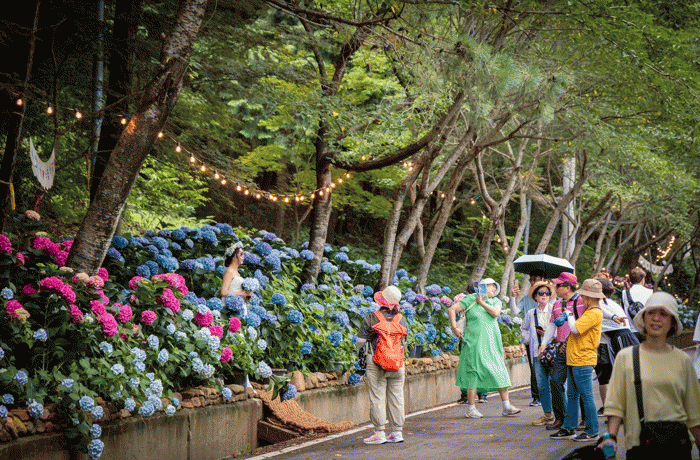 감성 포토존은 평소 보기 어려운 자주색, 파란색, 핑크색, 흰색 등 다양한 색깔의 수국들이 피어 있어 인생 사진을 남기려는 가족, 친구, 연인들로 긴 대기줄이 이어졌지만, 저마다 구경꾼이 되어 사진을 찍는 사람들을 바라보며, 기다림마저도 즐거운 시간을 보냈다.