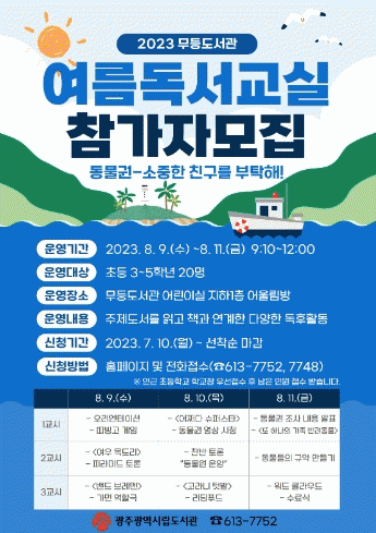 여름독서교실 참여 접수는 오는 10일부터 시립도서관 누리집 ‘문화행사’란에서 선착순으로 받는다. 수강료는 무료다. 강좌와 관련한 내용은 누리집 공지사항을 참고하거나 무등, 사직, 산수도서관으로 문의하면 된다.