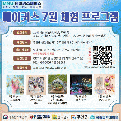 7월 체험 프로그램은 오는 7월 9일까지 과정당 3팀씩 선착순으로 모집 중이며, MNU메이커스페이스 홈페이지를 통해 세부 프로그램과 신청 방법 등 자세한 사항을 확인할 수 있다.