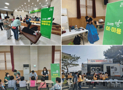 이날 행사는 남부대학교 평생교육원 약초탐방과의 대체의학 체험(이혈테라피, 뜸, 수지침, 물리치료 등), 고서면 보건지소의 건강상담(혈압, 당뇨 체크), 시각장애인협회 담양지회의 손마사지, 담양미용봉사회의 이·미용 서비스, 광주·전남 대한적십자봉사회의 세탁 봉사 등으로 채워져 어르신의 큰 호응을 받았다.