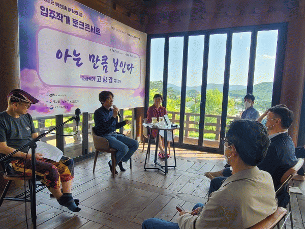 이원화 상주작가의 진행으로 8일 손병현 소설가(한국소설의 위기와 기회), 15일 신효철 극작가·연출가(희곡으로 바라본 시대의 정신), 22일 박노식 시인(시가 찾아오는 순간), 29일 옥경숙 소설가(오이 꼭다리 쓴맛, 호박잎 된장국)의 토크와 지역예술인들의 공연이 이어진다.