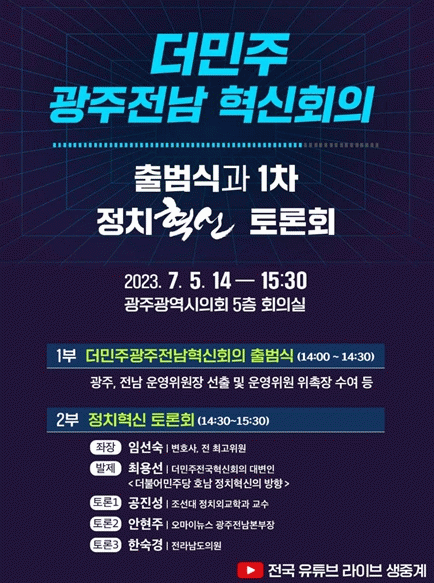 ‘정치혁신 토론회’는 오후 2시 30분부터 3시 30분까지 진행되며, 좌장으로는 임선숙 변호사(민주당 전 최고위원)가 참석한다. 이 자리에서는 더불어민주당 호님 지역의 정치혁신 방향에 대한 발제가 이루어지며, 더민주전국혁신회의 대변인인 최용선 씨가 발제자로 참여한다. 또한, 공진성 교수(조선대 정외과), 안현주 오마이뉴스 광주전남본부장, 한숙경 전라남도의원 등이 각각의 주제에 대한 토론자로 참여한다.