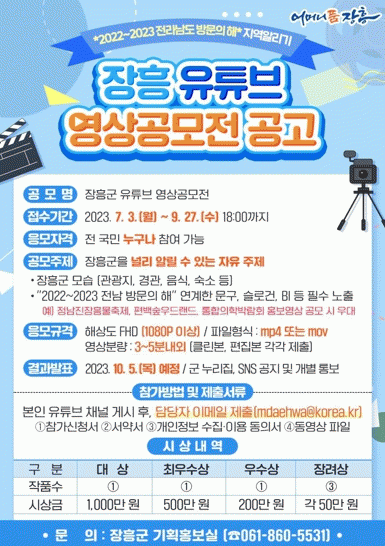 7월 3일부터 9월 27일까지 진행되는 이번 공모전은 관광지, 축제, 음식 등 장흥군을 알릴 수 있는 모든 소재를 대상으로 한다.