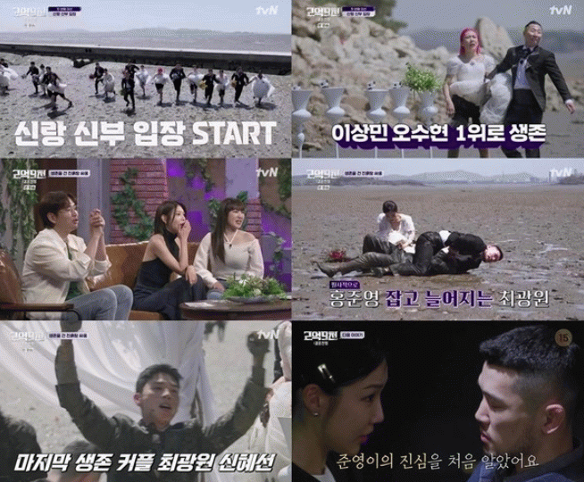 ‘신랑신부 입장’은 커플이 함께 500미터 갯벌을 전력 질주해 결승점에 통과한 7위까지 생존하는 미션으로, 8위로 탈락 위기에 처한 최광원-신혜선 커플이 앞서 달려나가는 홍준영-박나영 커플을 움직이지 못하게 필사적으로 붙잡아 최종 7위로 생존권을 얻게 됐다.