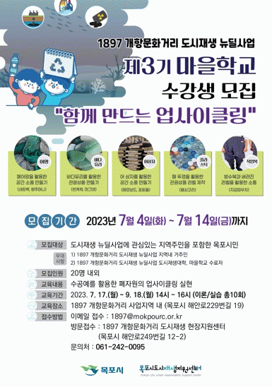 도시재생과 연계된 특색있는 교육과정이 될 제3기 마을학교는 ‘1897 개항문화거리, 함께 만드는 업사이클링’이 주제로, 오는 14일까지 지역주민을 포함한 시민 20명을 대상으로 수강생을 모집한다.