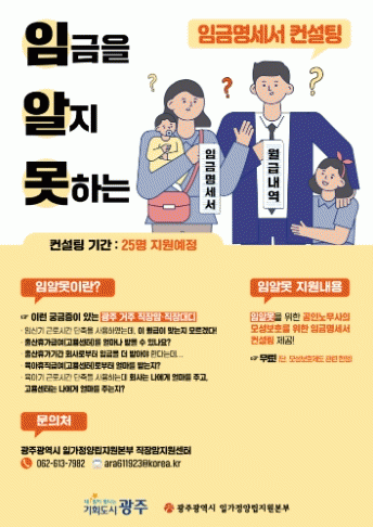광주시일가정양립지원본부는 광주 직장인 부모들의 모성보호제도와 일·가정 양립 지원제도 사용에 어려움을 덜기 위해 이번 컨설팅을 마련했다. 이 제도를 사용하면서 줄어드는 월급에 불이익이 없는지 확인하고 싶을 때 임금명세서 컨설팅을 신청하면 된다.
