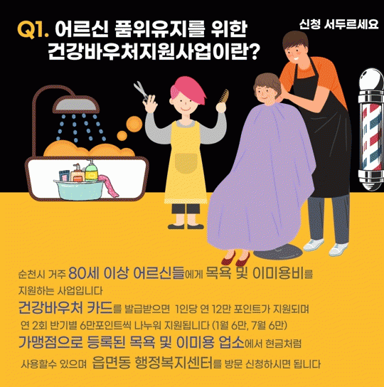 어르신 건강바우처 사업은 순천시가 지난해 1월부터 만 80세 이상 어르신에게 월 1만 원, 연간 최고 12만 원의 목욕 및 이·미용 비용을 바우처 형식으로 지원하는 제도이며 바우처는 가맹점으로 등록된 업소에서만 사용할 수 있다.