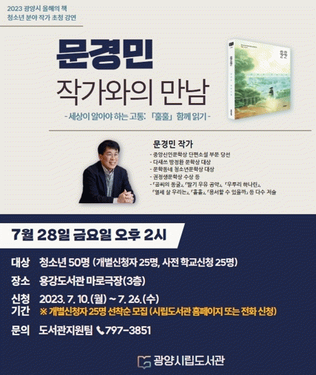 강연회는 관내 중고생 25명을 대상으로 오는 26일까지 광양시립도서관 누리집에서 참여 신청할 수 있으며, 시립도서관으로 문의하면 자세히 알 수 있다.