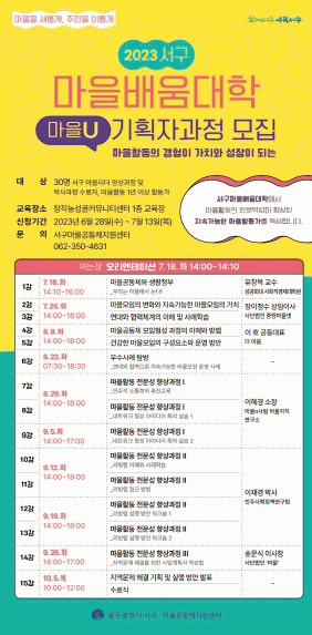 서구마을공동체지원센터 관계자는 “마을유니버시티 교육과정을 단계별, 분야별로 심도있게 구성?운영하면서 지속가능한 마을공동체 및 아파트공동체 활성화의 토대를 마련하고 주민이 중심되는 마을자치 실현을 앞당기겠다”고 말했다.