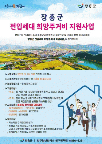지원대상은 타 시군구에 1년 이상 주민등록을 두고 있다가 2023년 3월 28일 이후 장흥군으로 전입 신고한 세대다.