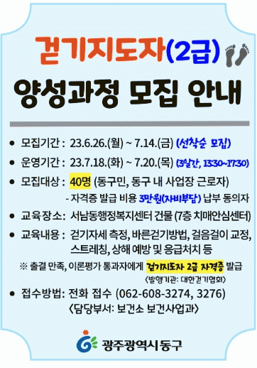 과정 이수자는 대한걷기협회에서 발급하는 걷기지도자 2급 자격증을 취득할 수 있다. 참여를 원하는 주민은 동구보건소 보건사업과로 전화 접수하면 된다. 교육비는 무료, 자격증 발급 비용(3만 원)은 개인 부담이다.