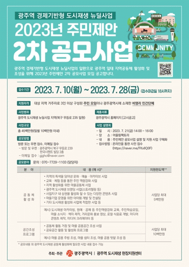 ‘광주역 도시재생 주민제안 공모사업’은 광주역 도시재생 권역 내에서 주민이 주체가 되어 도시재생 사업을 발굴한다. 광주역 경제기반형 도시재생 뉴딜사업을 추진하고 있는 광주시는 광주역 일대 지역공동체 활성화, 콘텐츠 사업 발굴, 공유공간 조성을 위해 이번 공모사업을 마련했다.