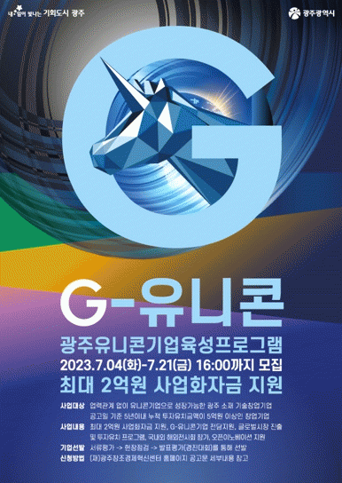 광주광역시는 ‘G-유니콘’ 광주유니콘기업육성프로그램에 참여할 광주지역 내 창업기업을 오는 21일까지 모집한다.
