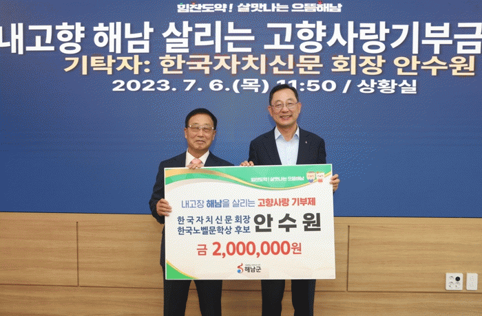 안 회장은“나고 자란 고향은 아니지만 제2의 고향이자 마음의 고향인 해남에 기부를 결정하게 됐다.”며“많은 분들이 농촌 소멸 위기 극복과 지역 균형 발전을 위한 고향사랑기부제에 대해 이해하고 관심을 가져주기 바란다.”고 말했다.