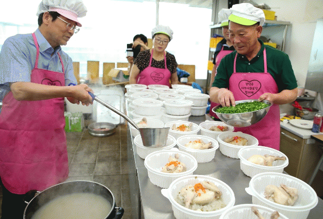 강진읍 지사협 위원들은 행사 전날인 9일부터 읍사무소 3층 조리실에 나와 녹두를 불리고, 닭을 손질하며, 삼복더위에 뜨거운 불 앞에서 정성으로 삼계탕을 준비했다.