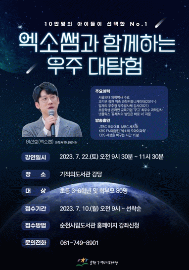 순천시 도서관 관계자는“과학지식을 쉽고 정확하게 전달하는 인기 있는 과학커뮤니케이터를 통해 아이들이 과학을 흥미롭게 접할 수 있는 기회가 되길 바란다”라고 말했다.