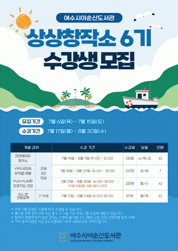 접수는 강좌별 10명 내외 선착순으로, 참여 희망자는 여수시립도서관 홈페이지에서 본인 또는 보호자가 신청하면 된다.