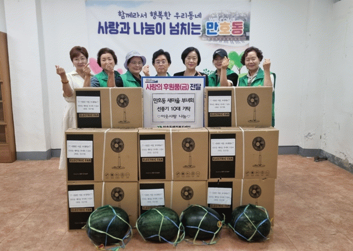 최혜강 만호동장은 “시원한 나눔 활동을 해주신 만호동새마을부녀회에 감사드리며, 무더운 여름 더위에 취약한 어르신과 소외된 이웃들이 건강한 여름을 날 수 있도록 더욱 살피겠다”고 말했다.