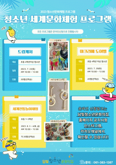 이번 프로그램은 오늘 7월 22일부터 8월 4일까지 총 4회기로 진행되며, ▲아메리카 인디언들의 문화 드림캐처(초등 4학년 이상) ▲서양 매듭공예인 마크라메 도어벨(초등 4학년이상) ▲세계전통놀이문화 체험(초등1~3학년)으로 각 20명씩 모집할 예정이다.